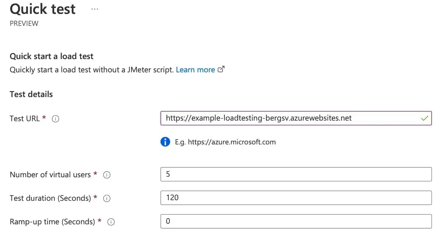 The complete URL Endpoint which you want to test against. For e.g., my web app https://example-loadtesting-bergsv.azurewebsites.net. -