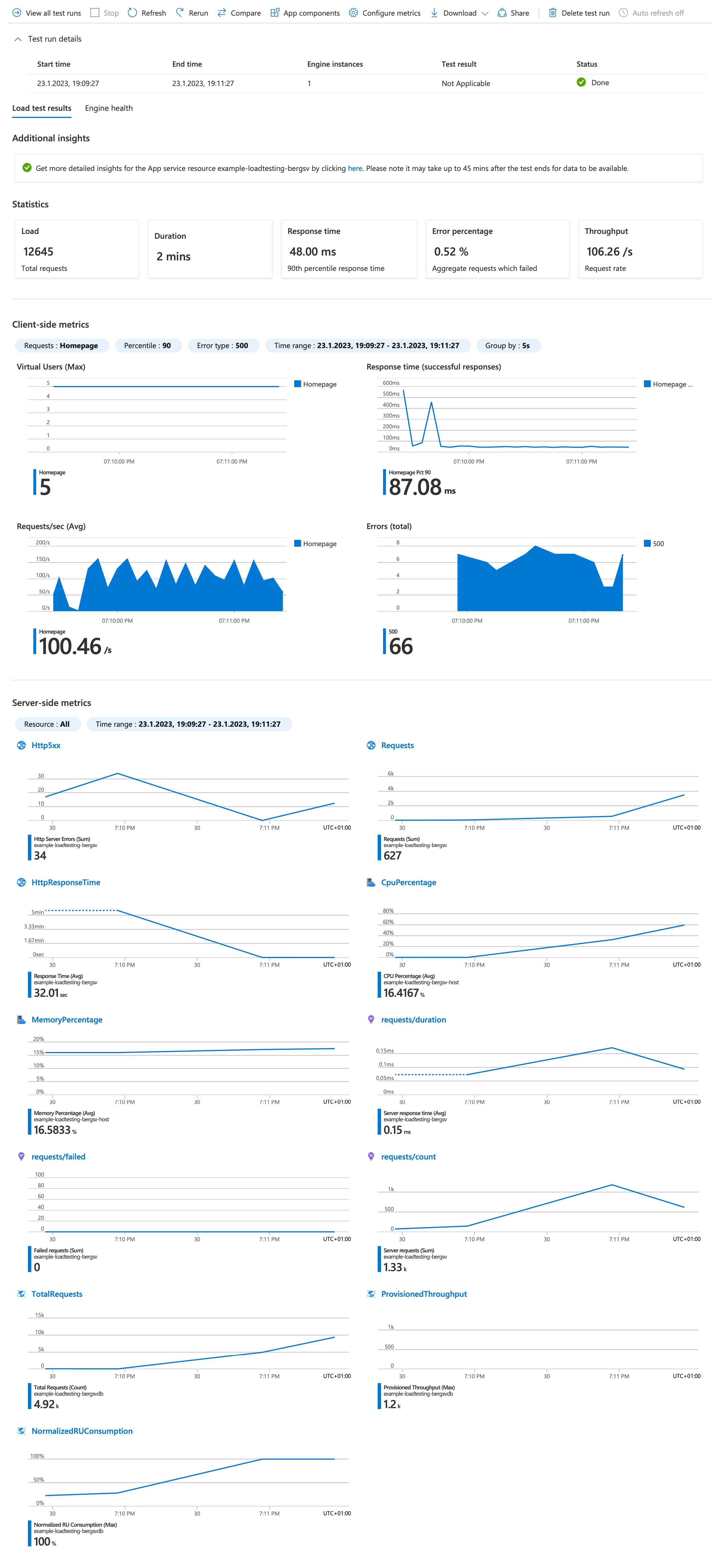 Once the load test is finished, you can evaluate the results, share them, repeat the test, compare it to previous tests, download the data as CSV, or include “App Components” in the results. This feature is awesome, as it allows you to integrate Azure resources, such as App Services or Virtual Machines, into the test. With these components included, you can view the metrics (such as CPU or memory usage) of the Azure resources being tested on the same page as the load test results, enabling you to analyze and understand how they performed during the test.