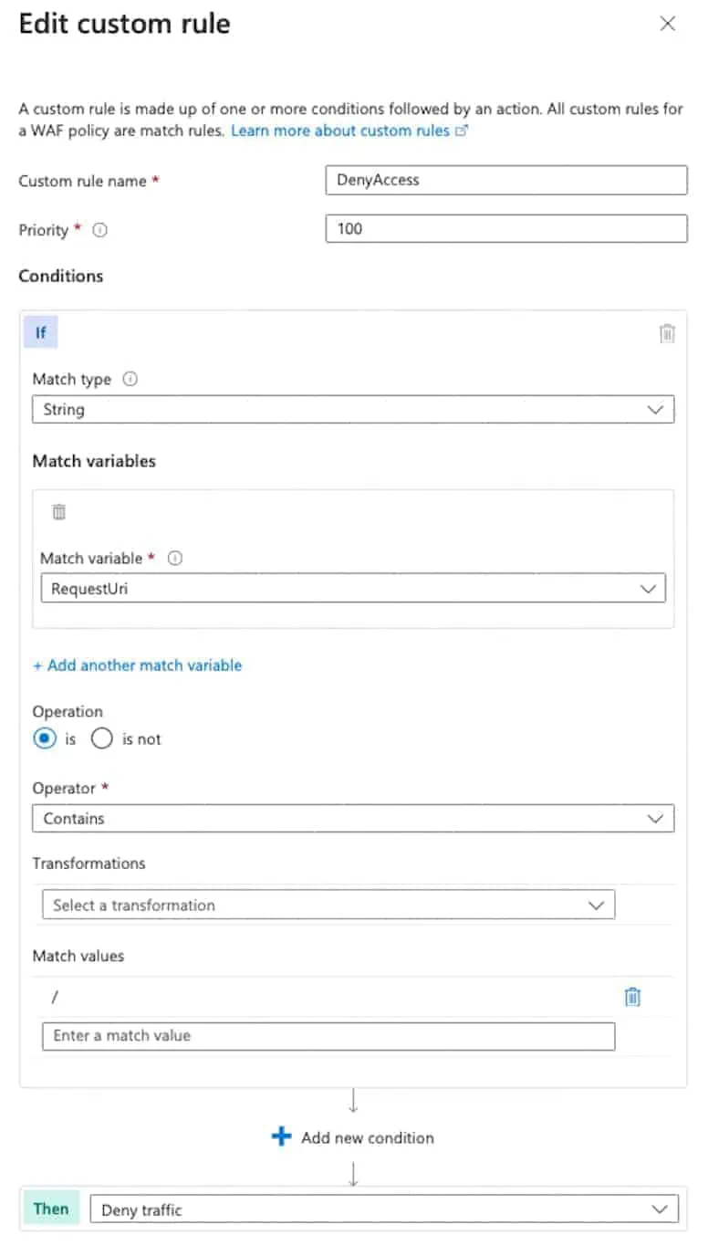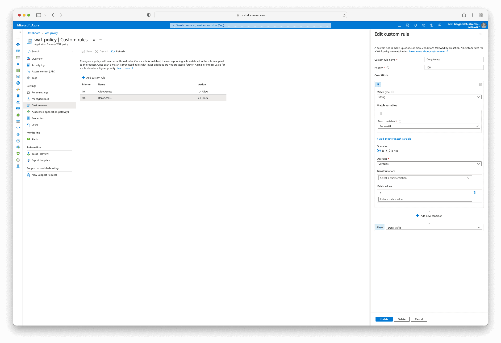 When the custom WAF Policy is created, you can navigate to the Custom rules section in the Web Application Firewall policies (WAF) Resource.