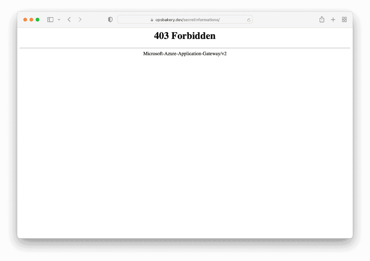 Now when I navigate to the domain https://opsbakery.dev/ (root path) or the “/secretinformations/” path of the website, the access is restricted as it should be due to the Implicit Deny Rule.