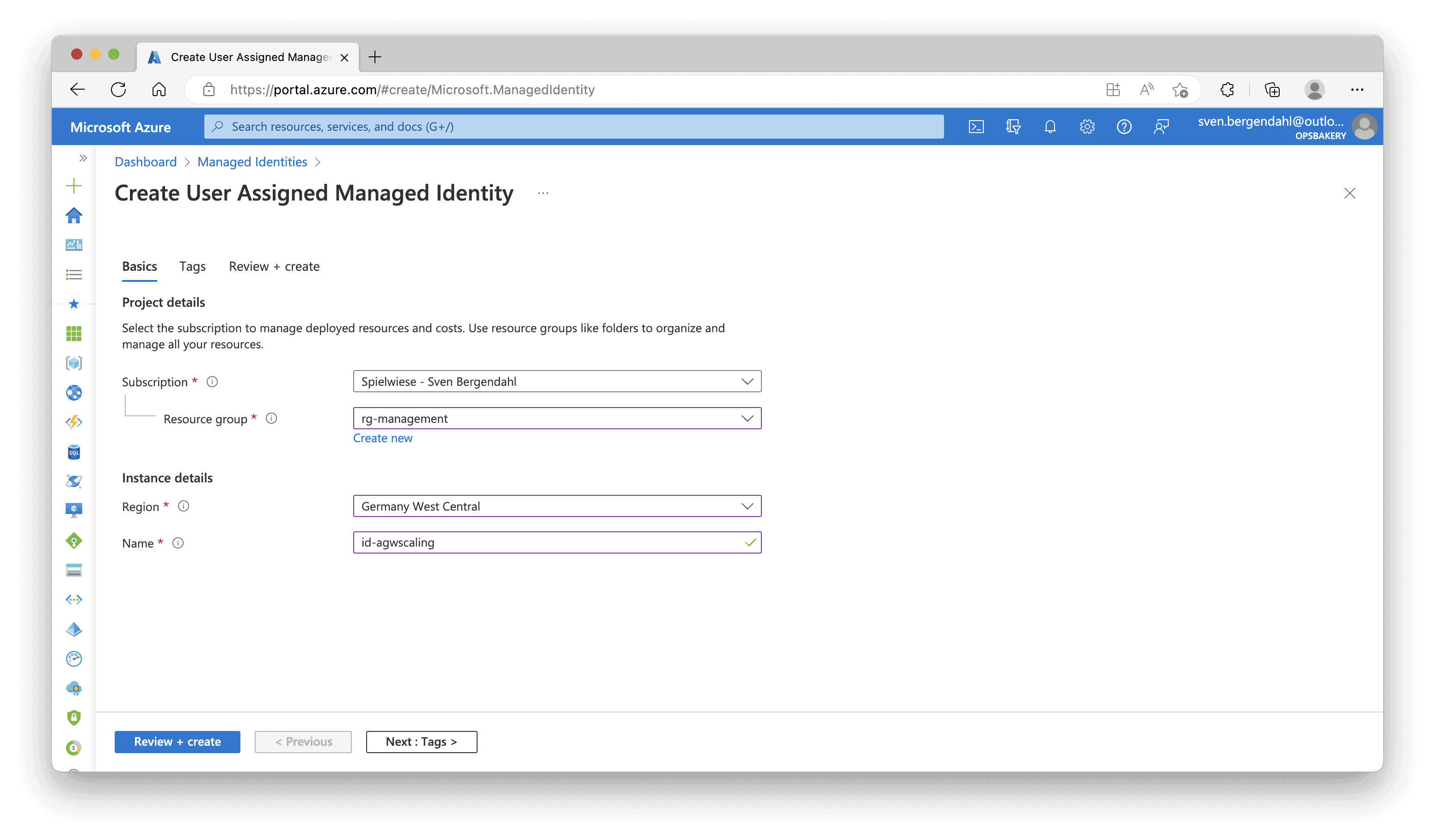 In the Azure Portal, navigate to the “Managed Identities“, there we click “+ Create” to create the User-Assigned Managed Identity. In my case, I made the Identity “id-agwscaling” into my existing Management Resource Group “rg-management” and put it in my nearest location: Germany West Central.