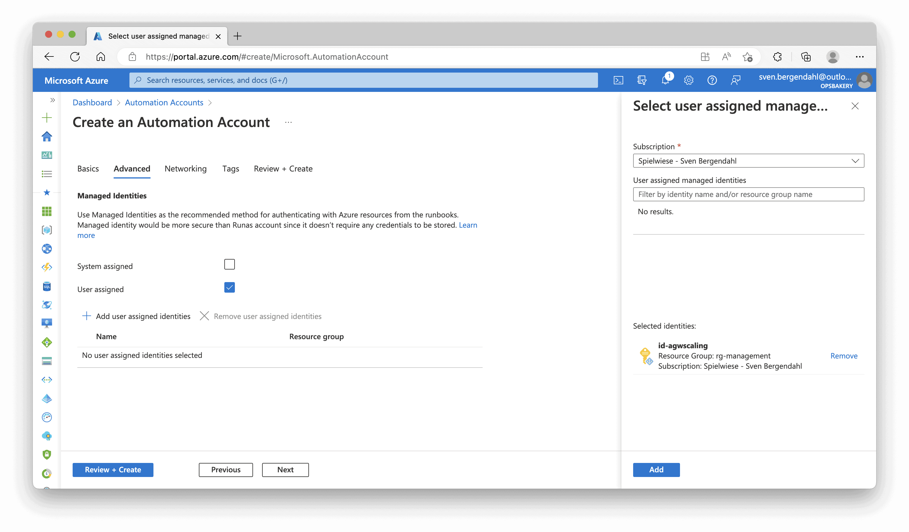 Now let’s create the Automation Account. In the Azure Portal, we’re searching for “Automation Accounts“, select “Automation Accounts” from the search result and hit “+ Create“. Fill in the required Information like Name, Resource Group, and Region, and click “Next“. In the “Advanced” Tab, you can uncheck the “System assigned” Identity and check the “User assigned” Identity. Select your previously created User-Assigend Identity from the Dropdown Menu and add your Identity to the Automation Account. Click “Review + Create” on the button on the page, and then “Create“.